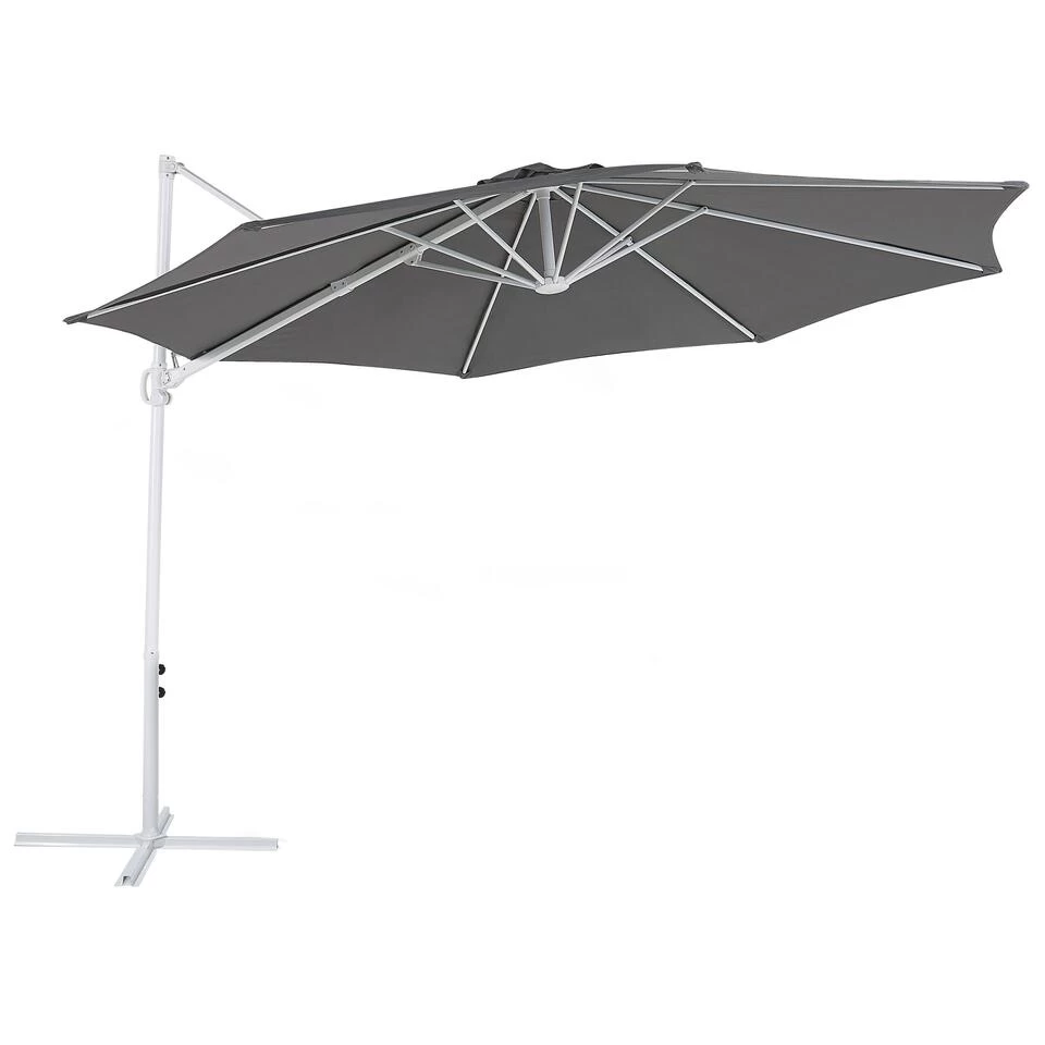 Stijlvolle paraplu voor zonnige dagen. Een achthoekige beige parasol die een vleugje elegantie zal toevoegen aan elk terras. Beschikt over een krukmechanisme dat moeiteloos openen en sluiten mogelijk maakt. De vrijdragende paraplu heeft een 360 graden draaifunctie, zodat u hem in de meest handige richting kunt richten. Gemaakt van duurzaam aluminium van de hoogste kwaliteit voor langdurig gebruik en 100% polyester dat bestand is tegen vlekken en ongunstige weersomstandigheden. Het moderne ontwerp van deze paraplu past bij elk tuinmeubilair.