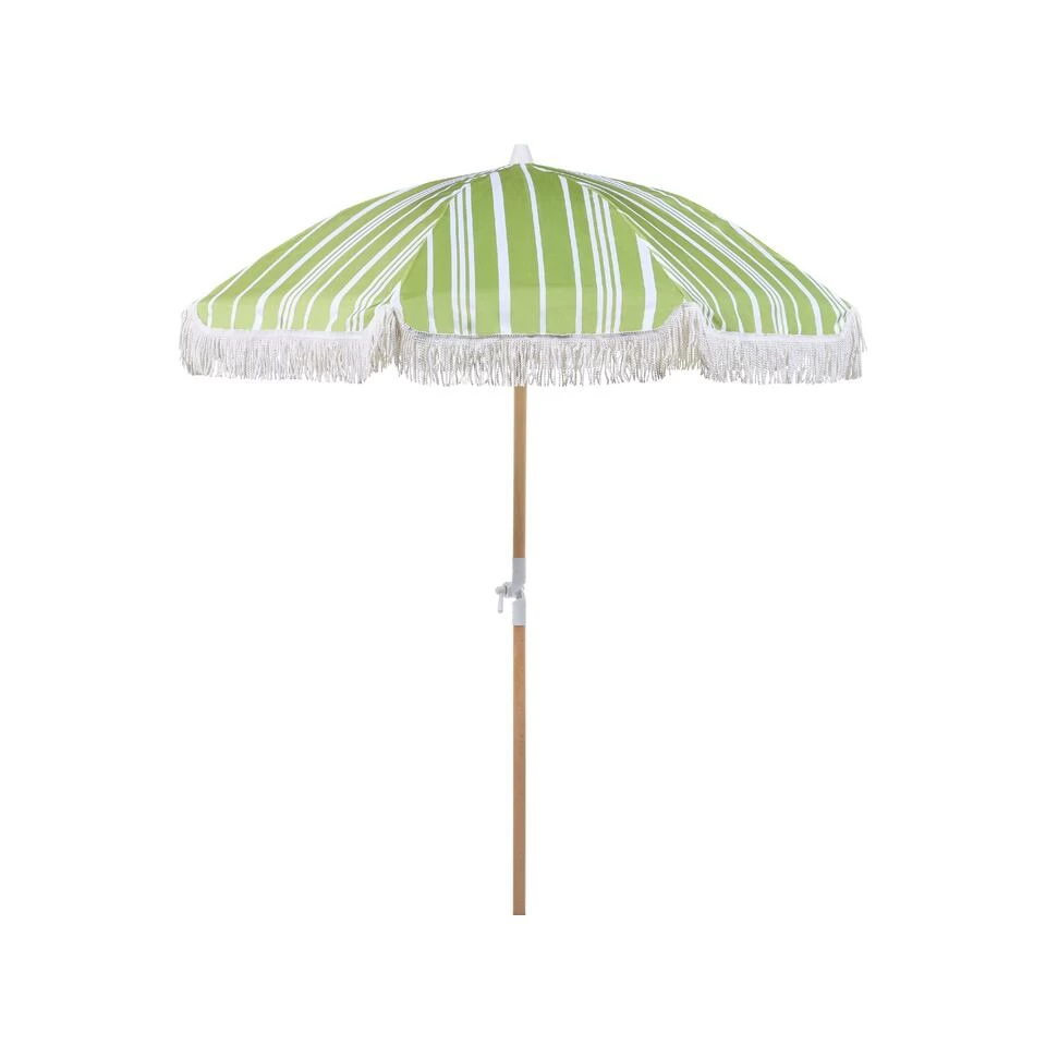Stijlvolle tuinparasol met kwastjes. Rust je tuin uit met deze parasol om de ruimte op te frissen en er een retrosfeer aan toe te voegen. Het stuk, dat wordt geleverd in een groen-witte kleur, is gemaakt van hoogwaardige materialen – de paal is gemaakt van beukenhout, dus het is zeer duurzaam en bestand tegen verschillende buitenomstandigheden. De paraplu beschermt je ook tegen de zon door het kantelmechanisme en een bovenkant van gerecycled polyester die UV-bestendig is. Bovendien wordt de parasol geleverd in een hoes met handgrepen, zodat je hem gemakkelijk kunt vervoeren of opbergen.