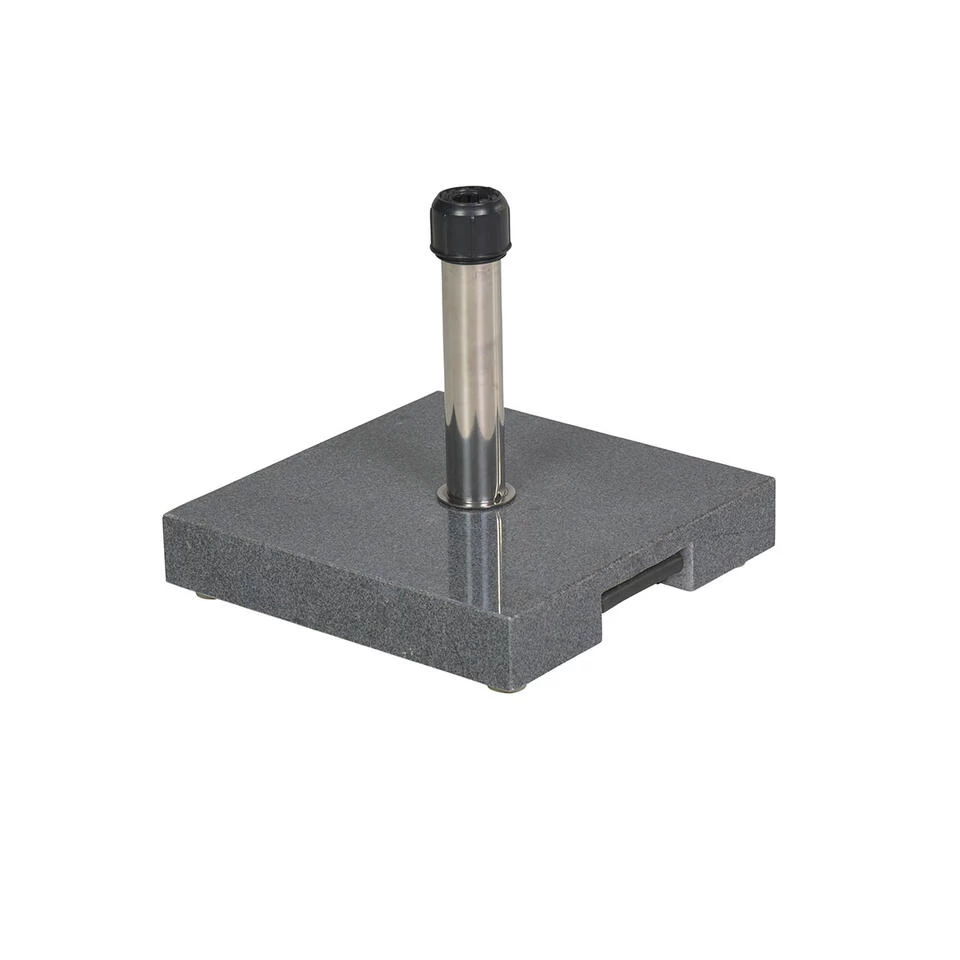 De Einstein granieten parasolvoet 40 kg is gemaakt van royal antraciet kleurig graniet waarvan de bovenzijde is gepolijst, dit geeft de voet een strakke en luxe uitstraling. De parasolvoet is voorzien van twee nylon wielen met aan de tegenovergestelde zijde een mooi RVS handvat. Hierdoor is de voet gemakkelijk te verplaatsen naar elke plek in de tuin. De parasolbuis is gemaakt van RVS en is geschikt voor stokparasols met een maximale buisdikte van 55 millimeter. De parasol kan goed worden vastgezet door de twee draaischroeven aan de zijkant van de buis.