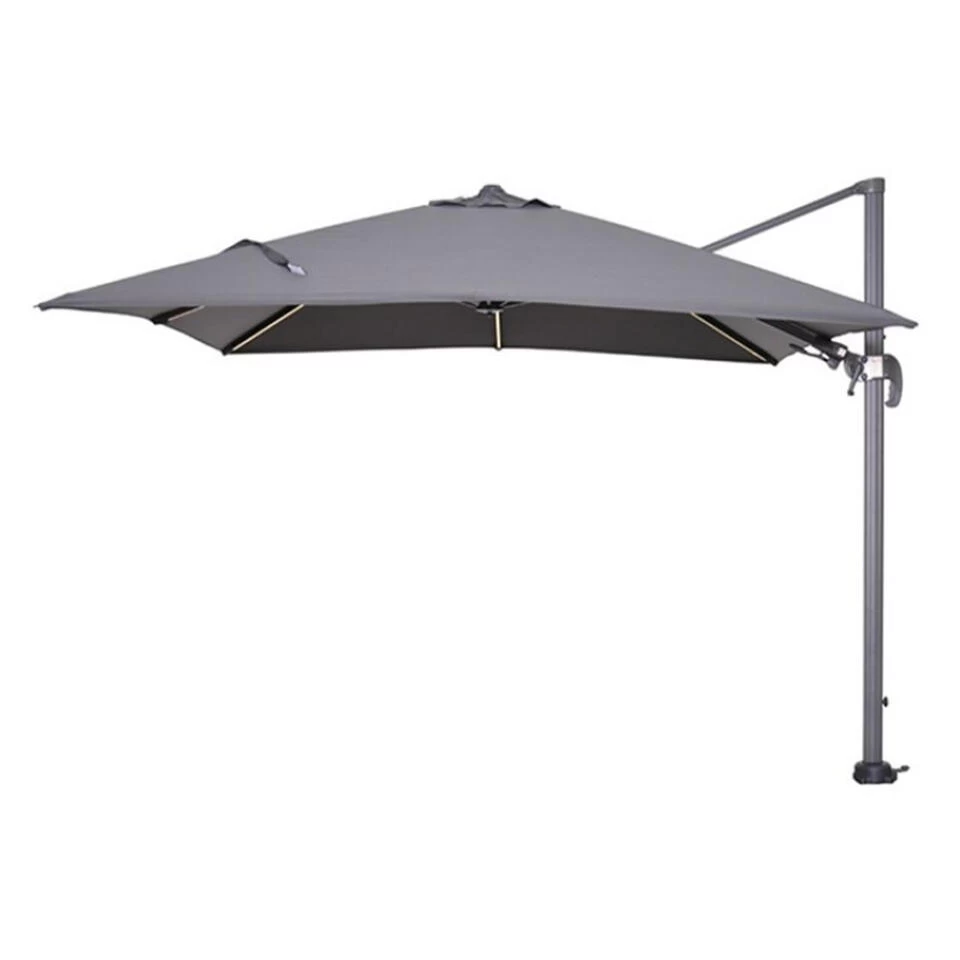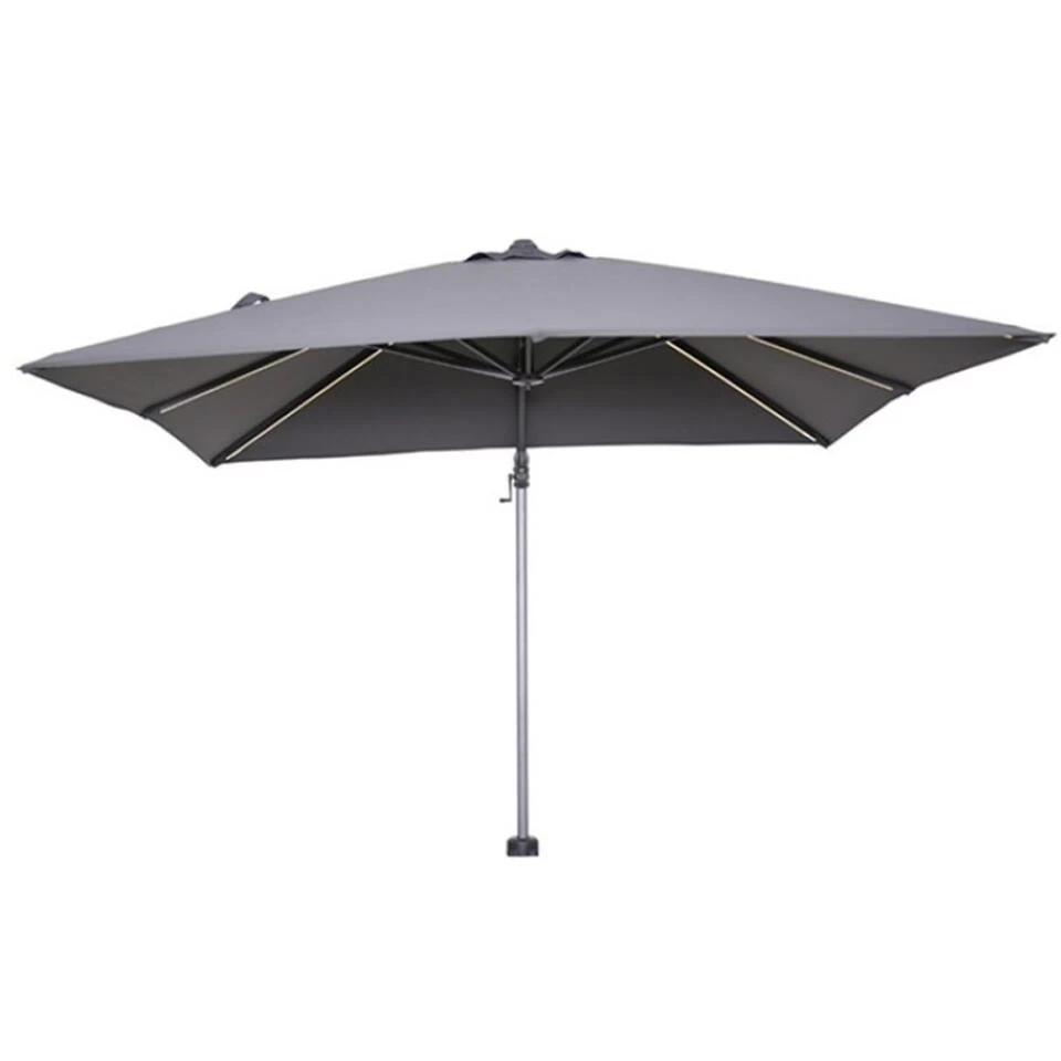 Zweefparasol Hawaii in de kleur Donker grijs. De zweefparasol heeft een afmeting van maar liefst 300×300 cm. wat ervoor zorgt dat de parasol een groot schaduw oppervlakt heeft. Het unieke aan deze Hawaii parasol is dat in de baleinen van de parasol ledstrips zijn geboud. Dit zorgt ervoor dat je als het in de avond donker wordt je onder de parasol ook nog wat licht hebt. Waardoor je dus nog langer buiten kan zitten met deze hawaii parasol met verlichting. De verlichting van de parasol werkt op accu’s. Hier worden er standaard 2 stuks van bijgeleverd.