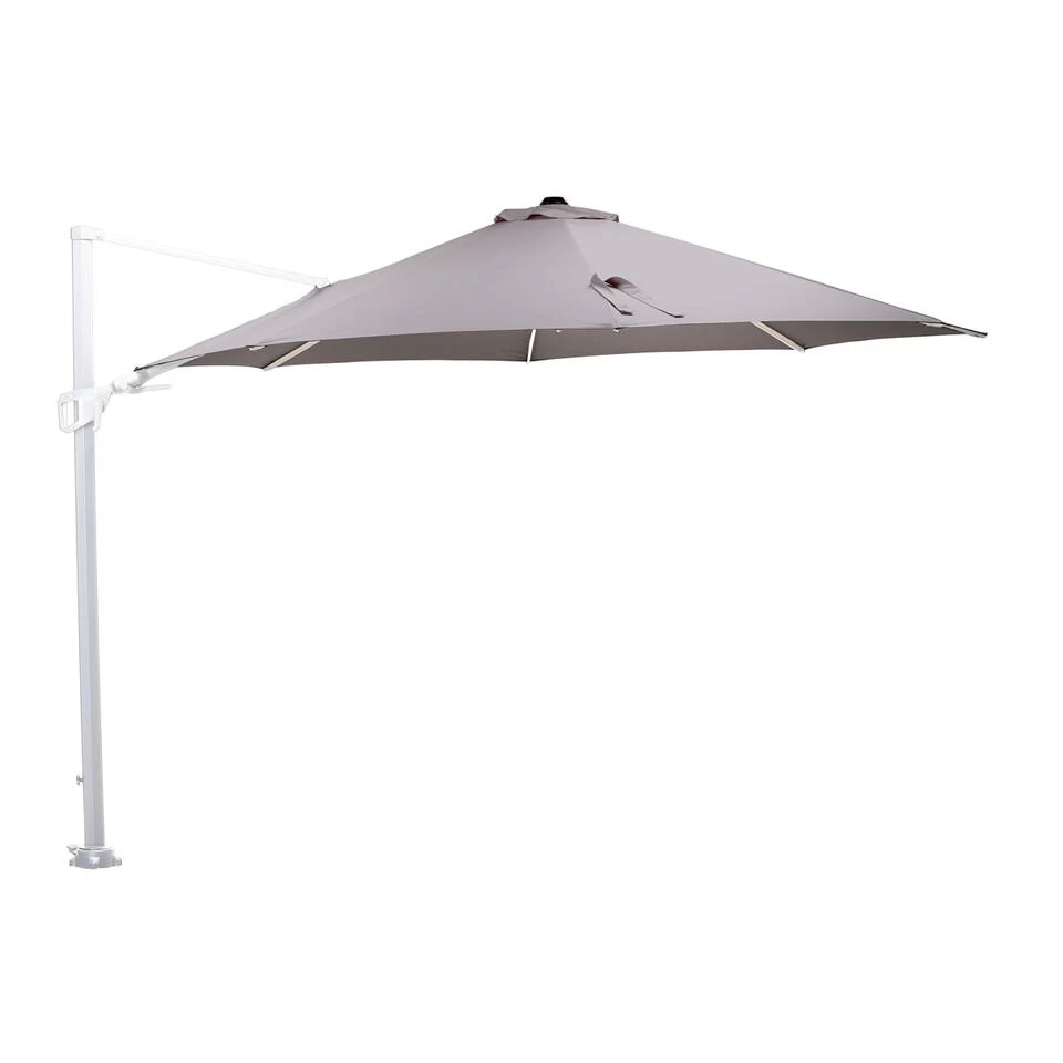 De Hawaii Ø350 zweefparasol is onmisbaar in elke tuin of balkon. Doordat deze parasol horizontaal, verticaal en 350 graden verstelbaar is, past deze overal. Je kunt zo op meerde plekken schaduw creëren door aan een hendel te trekken. En heerlijk genieten van de verkoeling. De Hawaii parasol is gemaakt van goede kwaliteit materialen. De parasol beschikt over een 250 grams polyester doek wat zorgt voor bescherming tegen de zon. Verkleuring van het doek door de zon is na verloop van tijd niet tegen te gaan. Bovendien is het doek voorzien van een brandwerende PA-coating en een windvanger, zodat de wind goed weg kan als deze onder de parasol komt. Het parasoldoek is spatwaterdicht. Het dikke aluminium frame is voorzien van een hoogwaardige kwaliteit poeder coating. Deze coating is dusdanig sterk dat het kras- en stootvast is. De baleinen van de parasol zijn voorzien van doekspanners, zodat het doek mooi strak wordt gehouden. De Hawaii parasol hoef je in principe niet te verplaatsen, want vanuit positie er je schaduw waar deze nodig is. De Hawaii parasol van Garden Impressions zet je gemakkelijk schuin door middel van het handvat schuif je het doek traploos schuin tot bijna 90 graden. Daarnaast kun je hem ook nog eens horizontaal verstellen. Dankzij het traploze handvat is elke gewenste stand haalbaar. Bovendien kun je de Hawaii parasol ook nog eens 360 graden rond draaien. Na gebruik kun je gebruik maken van een Hawaii parasolhoes welke los aangeschaft kan worden, hierdoor kun je de parasol tijdens zonnige dagen buiten laten staan. Bij slecht weer til je deze zweef parasol gemakkelijk van de voet en berg je deze op in de schuur. Aluminium in de kleur wit heeft als voordeel dat het onderhoudsvrij is, wanneer het aluminium vies is geworden door bijvoorbeeld opspattend regenwater kun je dit eenvoudig schoonmaken met een sopje van groene zeep en een zachte doek. Het doek van je parasol kun je het beste schoonmaken met een speciale Eden Outdoor doek reiniger. Wil je het doek beschermen tegen schimmel- en weerplekken, dan is hiervoor ook een product van Eden verkrijgbaar. Om het doek langer mooi te houden is het aan te raden om het product binnen op te bergen. Een parasol kan je daarnaast eenvoudig goed beschermen met een parasol beschermhoes als deze niet wordt gebruikt. Na ontvangst dient de Hawaii parasol nog gemonteerd te worden. Het draaiplateau moet op de bijbehoren voet worden gemonteerd. Daarna kan de binnen paal op het draaiplateau worden gemonteerd. Als laatste kan dan de Hawaii parasol erover geschoven worden. Dit is eenvoudig zelf te doen met de bijgeleverde handleiding en montage benodigdheden. De Hawaii parasol van het kwaliteitsmerk Garden Impressions is in vele afmetingen en diverse kleurstellingen te verkrijgen.