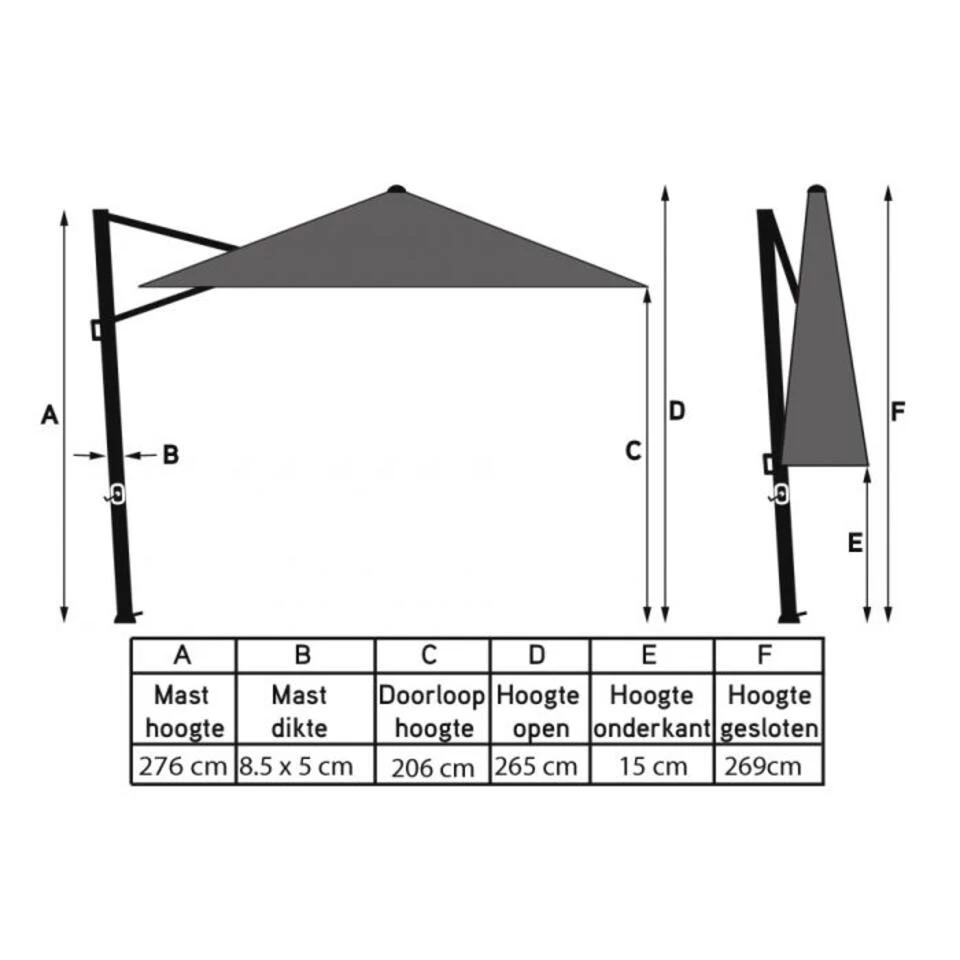 Op zoek naar een zweefparasol met bijpassende voet en hoes? Dan is de Platinum Challenger T1 4x3m. een aanrader. Deze grote zweefparasol wordt geleverd met een bijpassende parasolvoet van 120 kg. en een beschermhoes. De challenger heeft een antraciet frame en een Manhattan Grey parasoldoek. Het frame is gemaakt van aluminium. Dit materiaal is erg stevig en heeft als voordeel dat het niet kan verroesten. Het parasoldoek is gemaakt van Spuncrylic en is water en vuil afstotend.