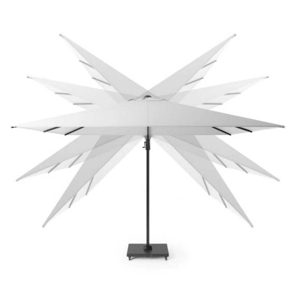 De Challenger T2 zweefparasol is voorzien van een voetpedaal waarmee deze 360 graden kan worden gedraaid. Zo kan je dus altijd in de schaduw zitten zonder de parasol te hoeven verplaatsen. Doormiddel van het speciale T2 systeem kan de parasol naar links en rechts worden gekanteld. Hierdoor kan je perfect inspelen op de stand van de zon. Daarnaast kan de parasol ook achterwaarts worden gekanteld wat erg handig is bij een laagstaande zon.