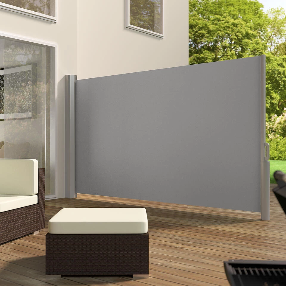 Dit mooie oprolbare windscherm geeft u privacy en bescherming tegen de wind. U en uw gasten kunnen hierdoor ongestoord in de tuin, op het terras of op het balkon verblijven. Door het automatische oprolmechanisme is het scherm in een paar momenten gereed. De robuuste, weerbestendige polyesterstof is zeer duurzaam en heeft bovendien een ingebouwde UV-bescherming. Het scherm heeft een maximale breedte van 3 m. Na gebruik rolt het doek van het scherm door het ingebouwde trekveermechanisme weer terug in de aluminium behuizing. De montage bestaat uit slechts enkele stappen. Er moeten wel een behoorlijke hoeveelheid gaten in de bodem en wand worden gemaakt voor de bevestiging van het scherm. Schroeven, pluggen en beugels worden meegeleverd.