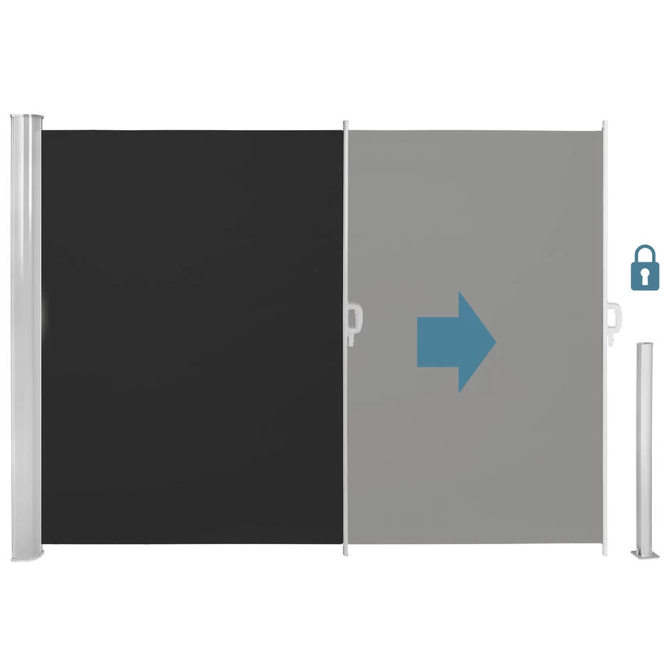 • Materiaal: Textielsamenstelling doek 100% polyester (240 g / m²), PU-coating, schermbehuizing en steunpalen van gepoedercoat aluminium, kunststof elementen
